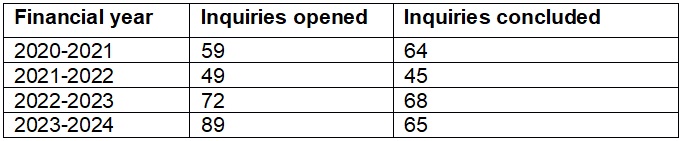 The Commission publishes data each year in its annual report and accounts on the number of statutory inquiries opened and concluded that year. The 2024-25 report is not yet available, but data from the previous four financial years reveals the following: